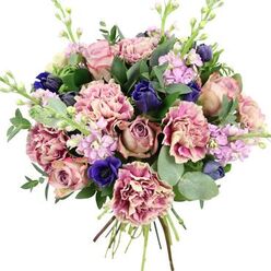Immerse yourself in the stunning beauty of our exclusive bouquet, featuring vibrant blue hydrangeas, delicate light purple roses, lush green lisianthus, elegant white spray roses, charming Ammi visnaga, soft pink bouvardia, and graceful pink astilbe. This unique combination creates a magical display that is perfect for any occasion.
